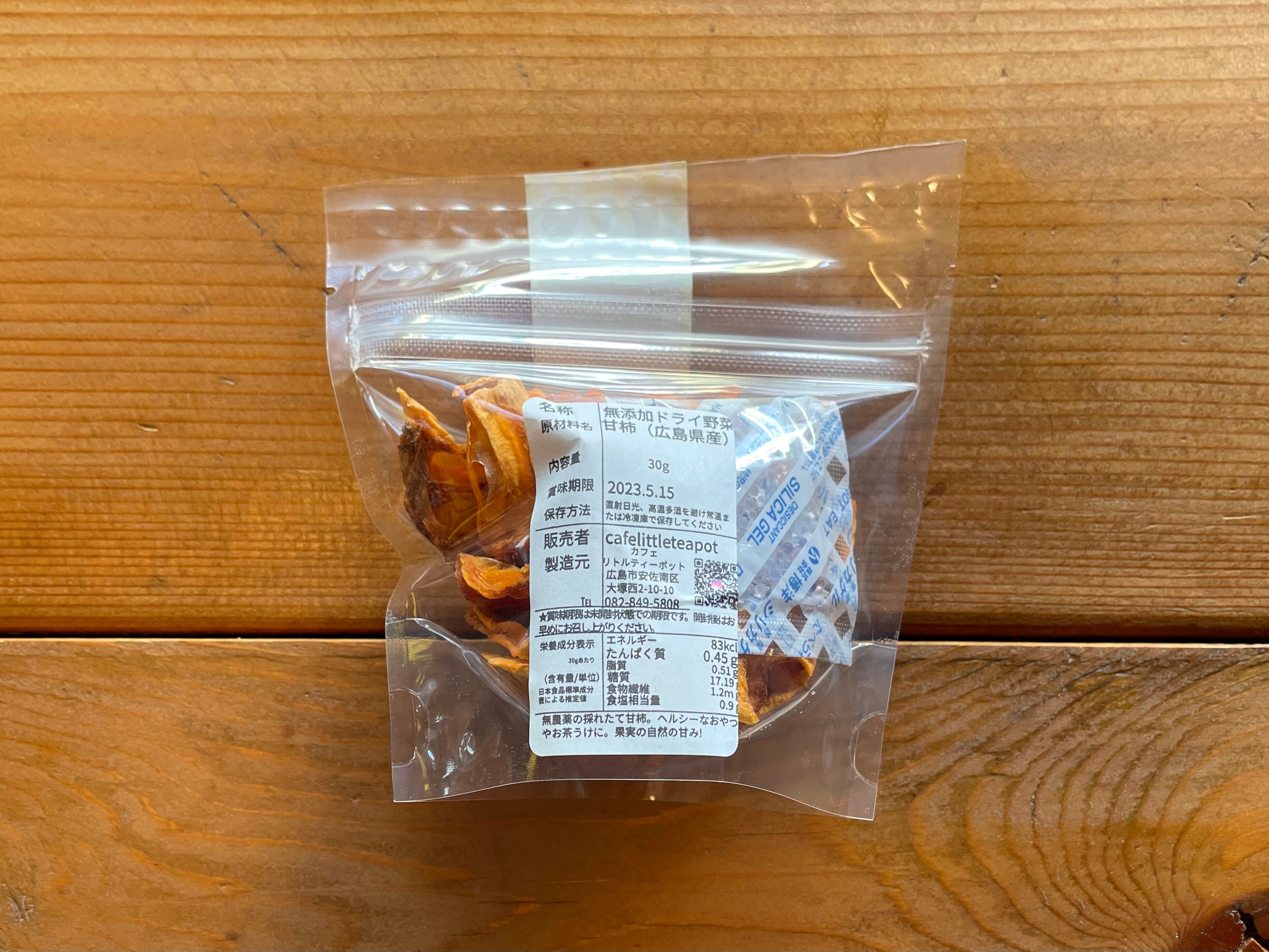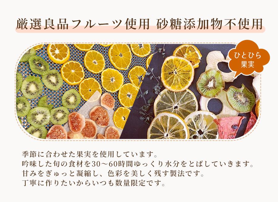 甘味を「ぎゅっ」と凝縮し、色彩を美しく残すために、30~60時間かけてゆっくりと水分をとばす製法で作り上げた、無添加のドライフルーツです。無農薬の甘柿。